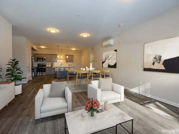 Apartments include a full kitchen, dining and living room, two bedrooms, in-unit washer/dryer, ample closets and private patio/deck. In addition to the main bathroom, most units have en suite primary bathrooms.